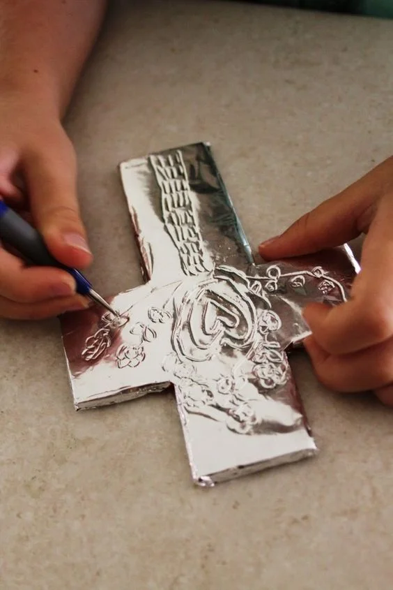 Use cardboard shapes, sharpies and aluminum foil to create beautiful sculpted art pieces, inspired by Mexican tooling art techniques. The process includes working a rounded tool on the back side of of soft metal or aluminum foil to create a beautiful piece of raised art, traditionally called Repujado.