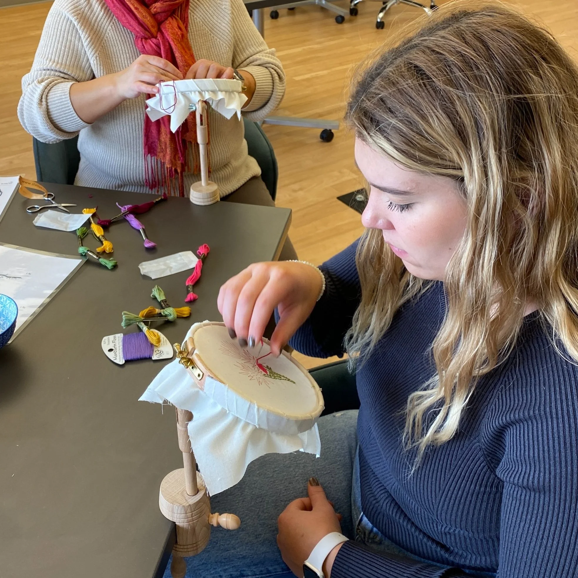 The class kit includes embroidery floss, needles, pre-traced fabric, and stitch diagrams. Scissors and hoops will be provided for the duration of the class.