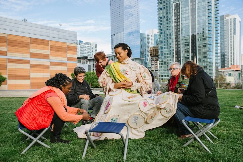 Liz Harvey is a queer artist who makes textiles, collages, watercolor paintings, and performances in order to disorient viewers and envision speculative liberatory futures. She uses craft processes to shed light on historical erasures of queer history and plant stories. Recent work highlights embroidery, audience participation, and time travel as vehicles for exploring the impact of climate change with a focus on the exponential increase in the rate of plant extinctions. Harvey also generates imagery from discarded materials and textile surplus to create collages, banners, headdresses, and capes, including textiles “from the future.” In Harvey’s performance projects, she collaborates with choreographers and scientists, frequently bringing dancers engaging with objects to public gardens and urban spaces. Recently, her work has been shown at the Museum of Craft and Design in San Francisco, Round Weather Gallery in Oakland, Terrain Biennial in Alameda, and Plan-d Gallery in Los Angeles. Her work has been featured in Feral Fabric Journal, 48hills, and the San Francisco Examiner. She has been an artist-in-residence at Montalvo Arts Center, the Bay Area Discovery Museum, the de Young Museum, the San Jose Museum of Quilts and Textiles, and Salesforce Park in San Francisco. Harvey’s work is in the permanent collection of the San Jose Museum of Quilts and Textiles and her studio is in Oakland.