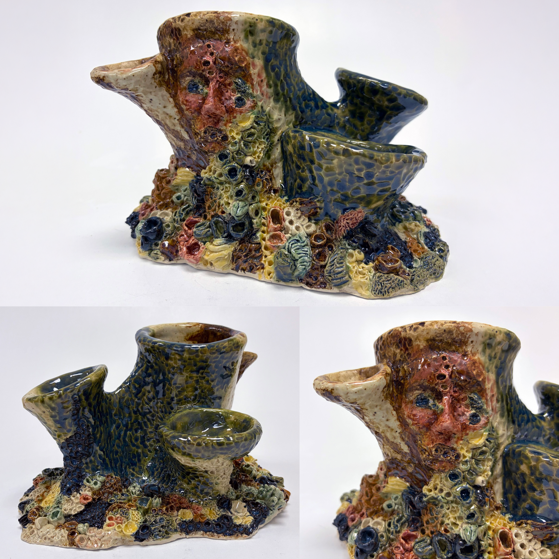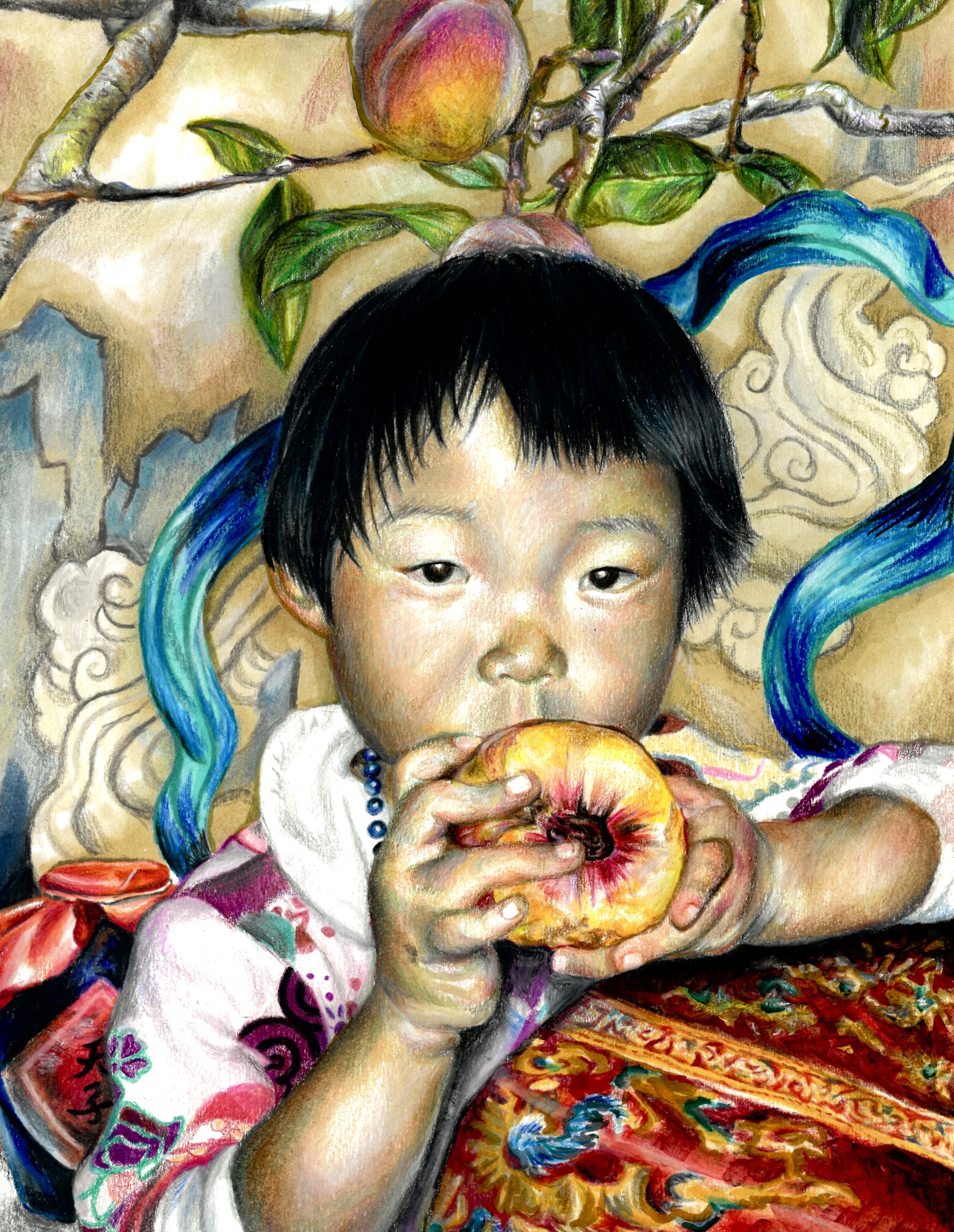 Pictured, from top to bottom: Annie Liang, Jin Tao (金桃): Golden Peach, Color Pencil, Branham High School, Grade 10, Instructor: Helen Yang. Katelyn Wang, The Seaside Is My Cradle of Memories, Mixed media on canvas: acrylic paint, sand mixed with gel medium, hand-sewn canvas elements, twine, and beads, Valley Christian High School, Grade 12, Instructor: Jill Carlson. Angela Fang, Environmental Shaping, Ceramic, Acrylic, Palo Alto High School, Grade 11, Instructor: Michael da Ponte. Zac Vaughn, Thoughts From Across The Sea, Charcoal, Cupertino High School, Grade 10, Instructor: Gabriel Coke.