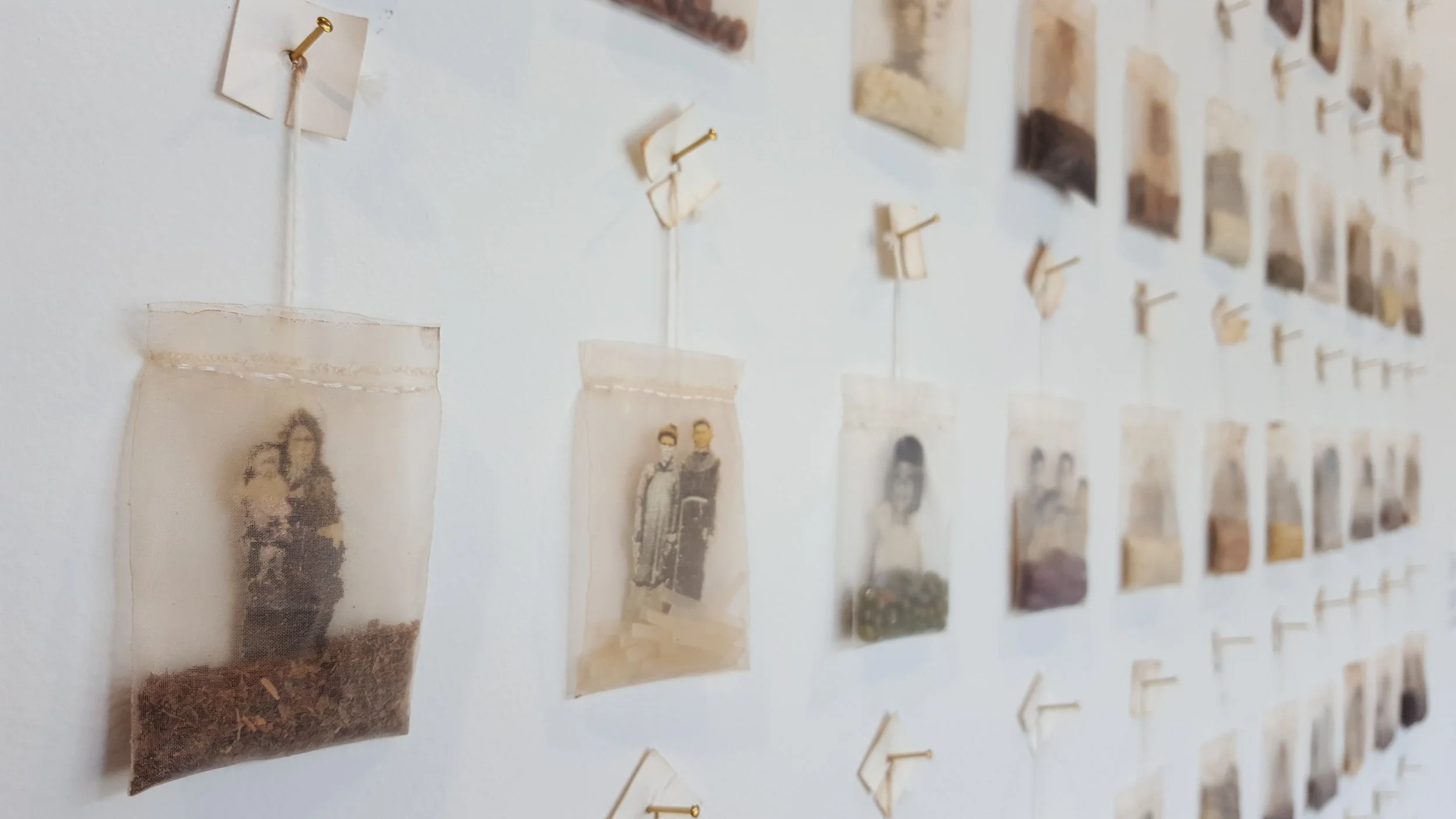 Trinh Mai, Begins With Tea (2013), family photos printed on Joss paper, grains, seeds, herbs and dried noodles, encapsulated in Bà Ngoại’s (Grandmother) used tea bags.