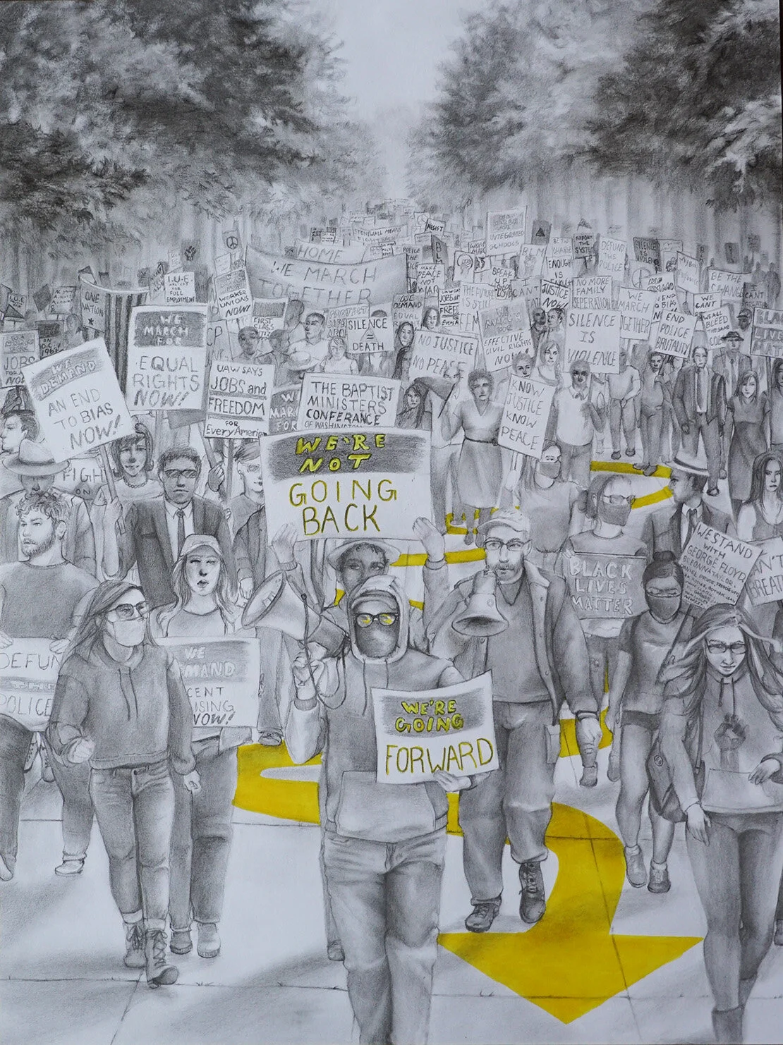 Danika Vadnais, We're Not Going Back, Graphite, Charcoal, Copic Marker, ArtNow 2021