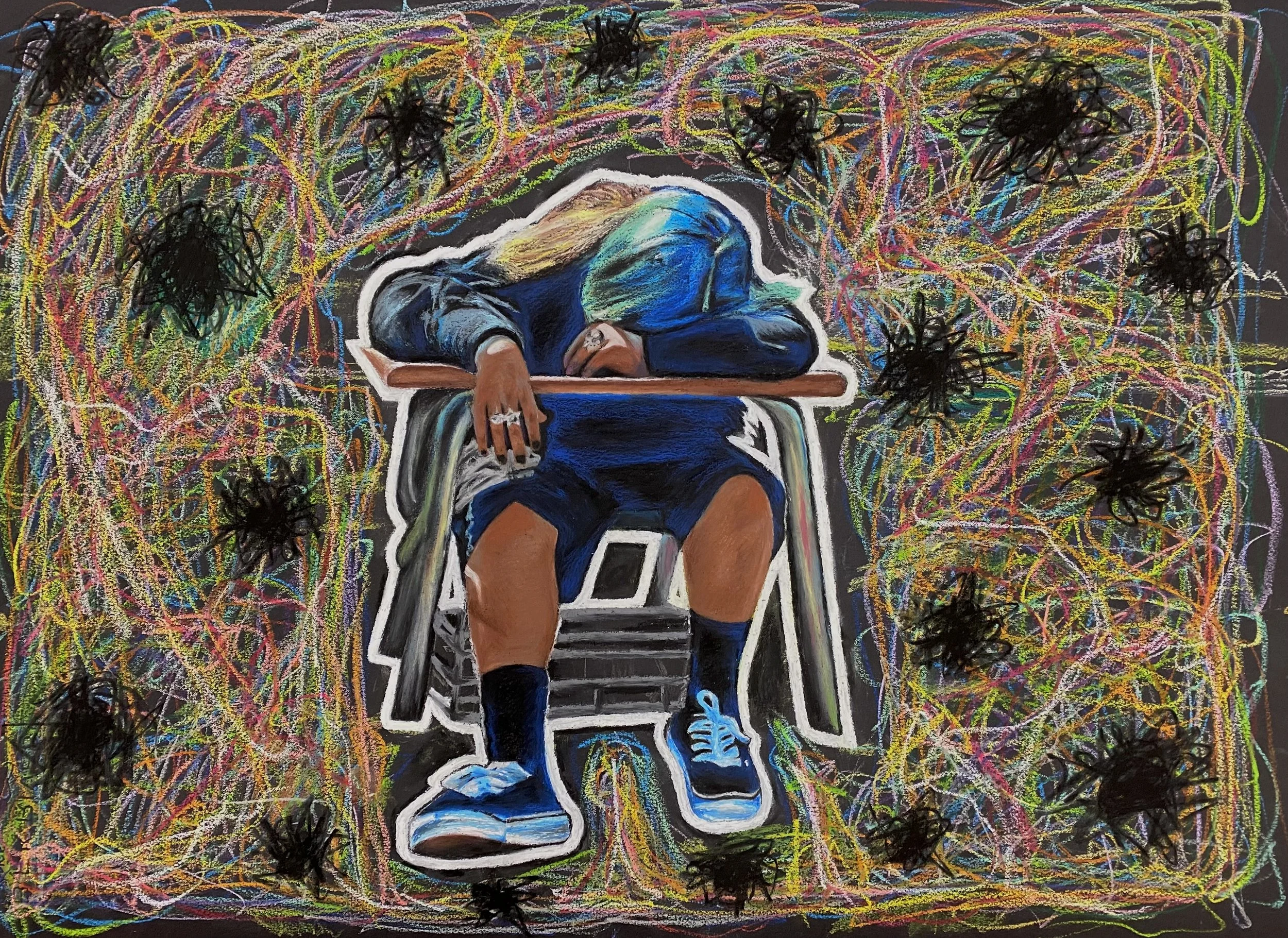 Henika Flores-Stoupignan, “im tired”, oil pastels