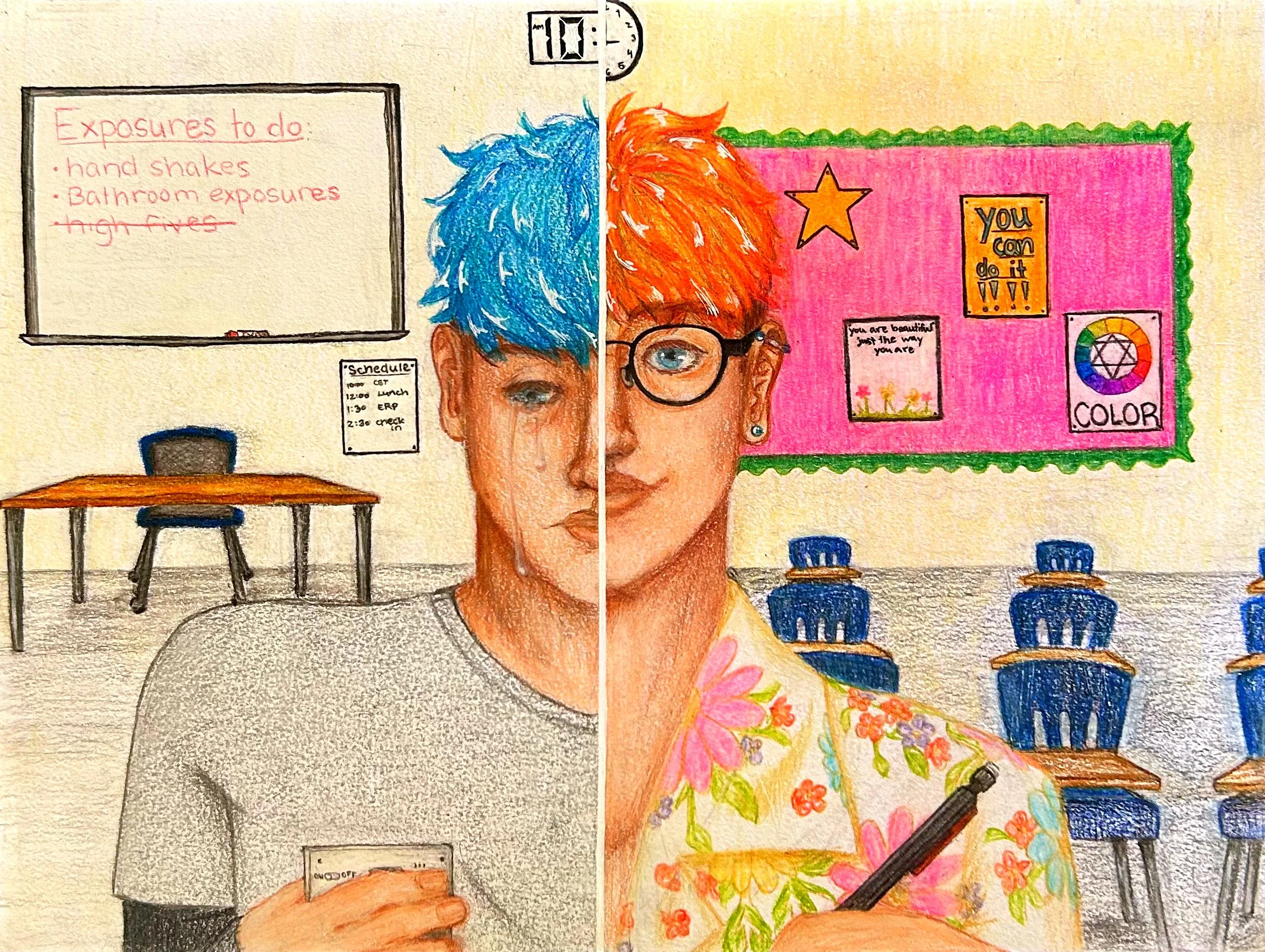 Since my OCD (Obsessive-Compulsive Disorder) diagnosis at seven, I have struggled with mental health. As I grew, so did the severity of my symptoms. By the time I entered middle school, I was having panic attacks daily and leaving the house became a challenge. At thirteen years old, I entered a treatment program for four months where I began Exposure Response Prevention Therapy. It was extremely difficult but it improved my life substantially. This piece represents my work, my progress, and my fight against OCD. This is me before and after; this is me taking my life back.