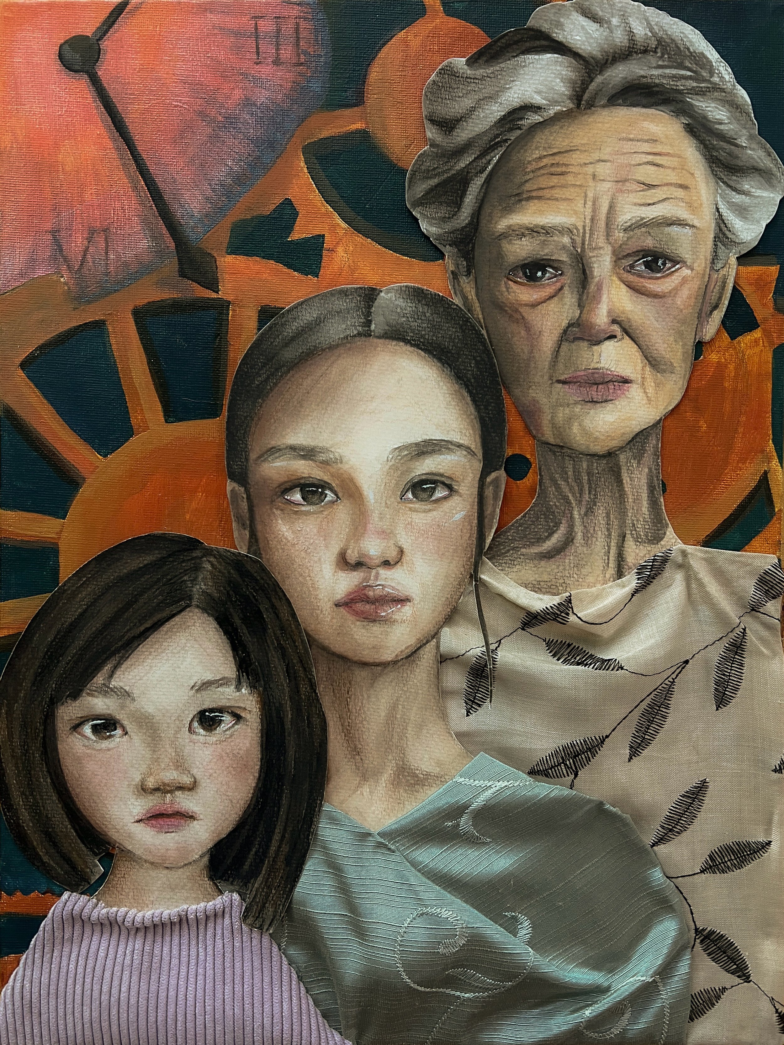 Mabel Tan, Metamorphosis, acrylic paint on canvas, gouache on watercolor paper, fabric