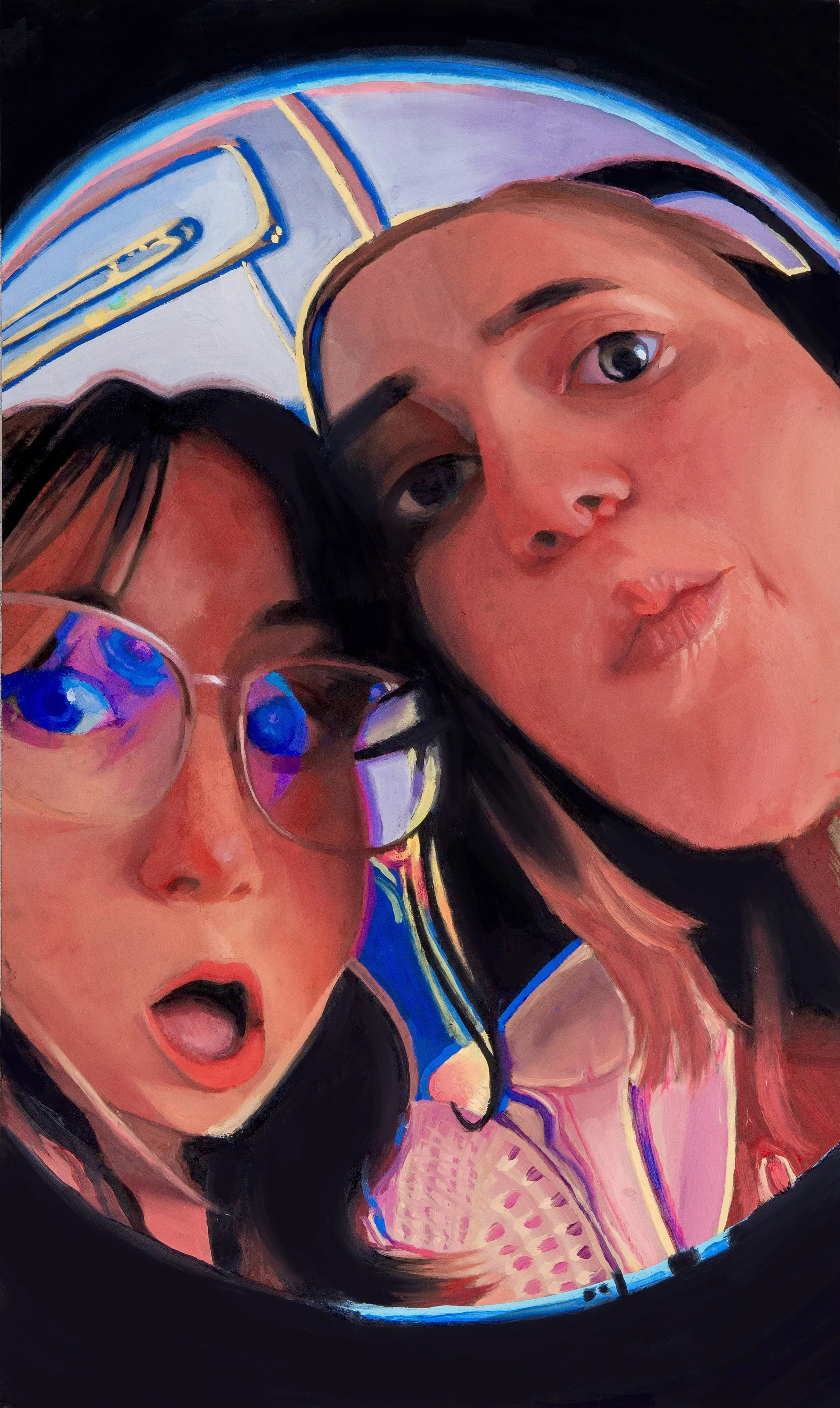 This piece is an exploration of the transition of childhood to adult friendships. The squatting figure is my best friend since birth named Aixia, who is looking into the distance symbolizing our anticipation for the future. The standing girl represents me. My head is obscured, representing our diverging paths as we head off to different colleges. The matching dresses are a nod to the our 18 years of shared memories, as well as the orange underpainting, our favorite color. This artwork celebrates a friendship that withstands life's transitions and changes. No matter distance or time, true connection is unbreakable.