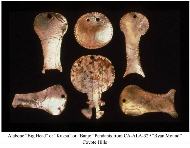 The analysis of the assemblages from this site was completed in 1993 by Muwekma Tribal archaeologist Alan Leventhal. This site yielded the most extensive population of distinctive ”Big Head” abalone shell pendants, which are believed to represent affiliation in the formally structured Kúksú religion. As a result, the Muwekma Language Committee decided to reclaim, by renaming this significant ancestral cemetery site “Mánni Muwékma Kúksú Hóowok Yatiš Túnnešte-tka” (Place Where the People of the Kúksú (Bighead) Pendants are Buried Site.)