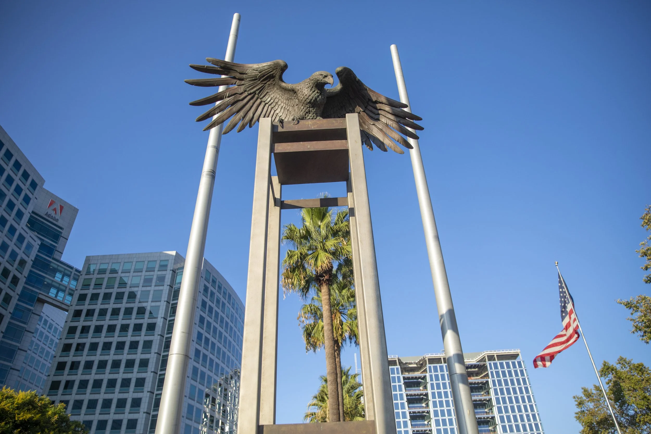 “The Muwekma Ohlone people, Native Americans who once lived along the Guadalupe River, are honored with animal sculptures important to their tradition, on the Park Avenue Bridge. These include the Coyote, the Hummingbird, and the Eagle. The four flags that fly from atop the bridge represent the past and present governments of the area: Spain, Mexico, California and the United States. The Coyotes were created by artist Peter Schiffrin; the Eagle and Hummingbirds by Todd Andrews.